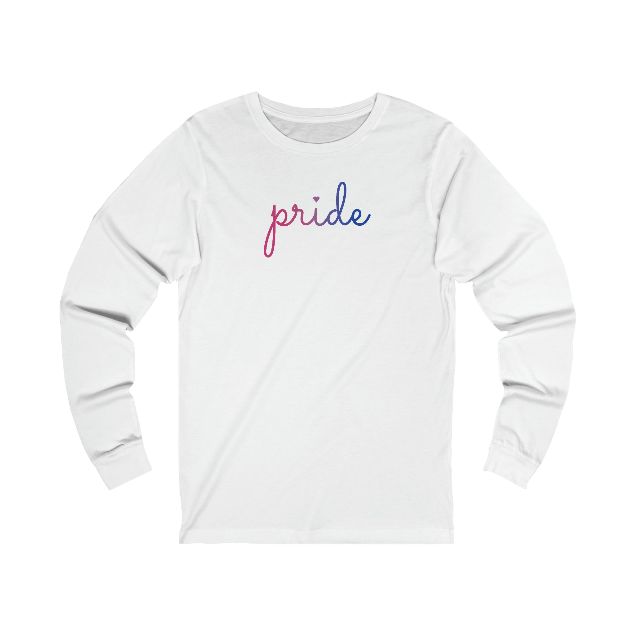 Bisexual Pride Long Sleeve T-Shirt: Flowing Cursive 'Pride' in Gradient Hues