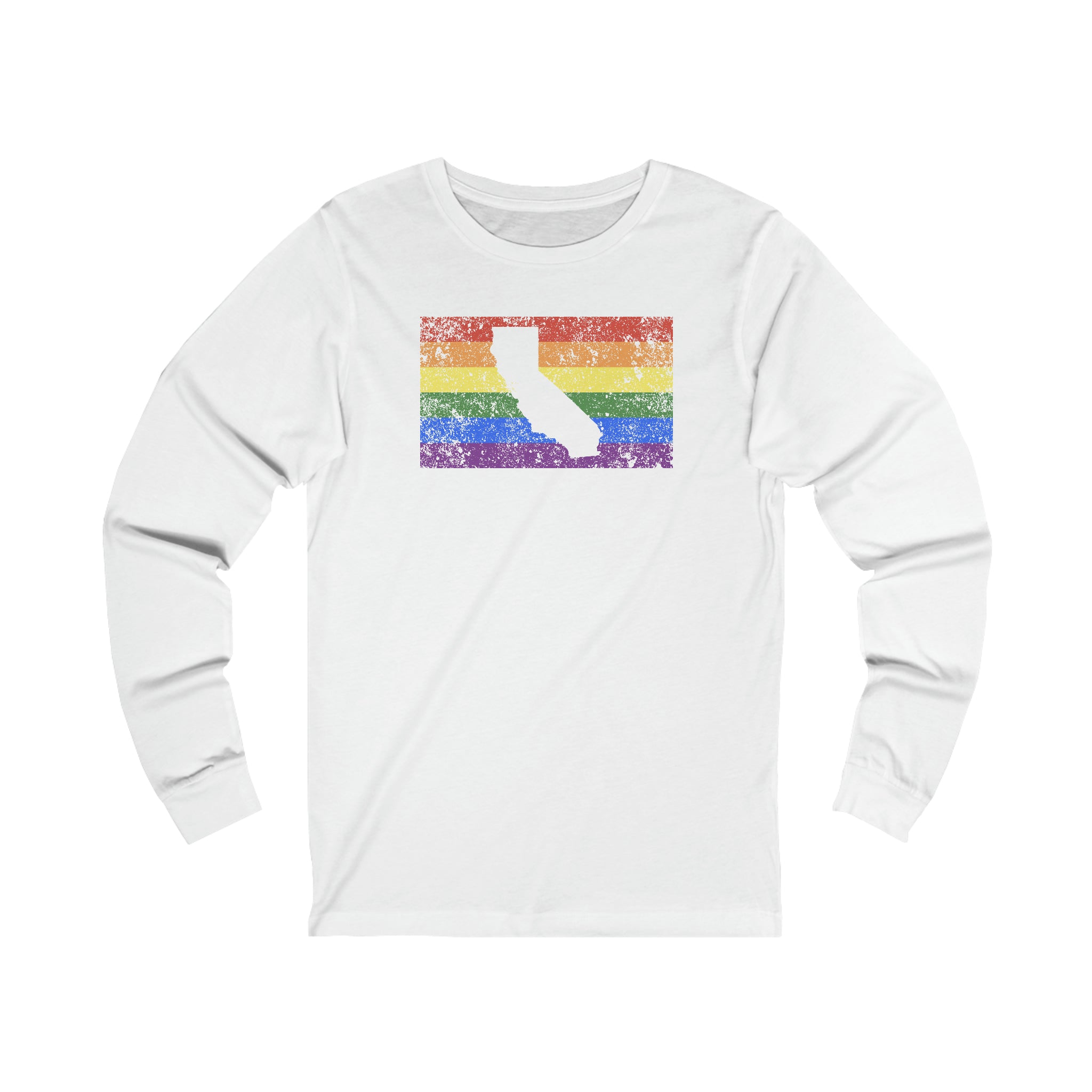 California Pride Flag Long Sleeve Tee: Rainbow LGBTQ+ State Silhouette Distressed Long Sleeve T-Shirt