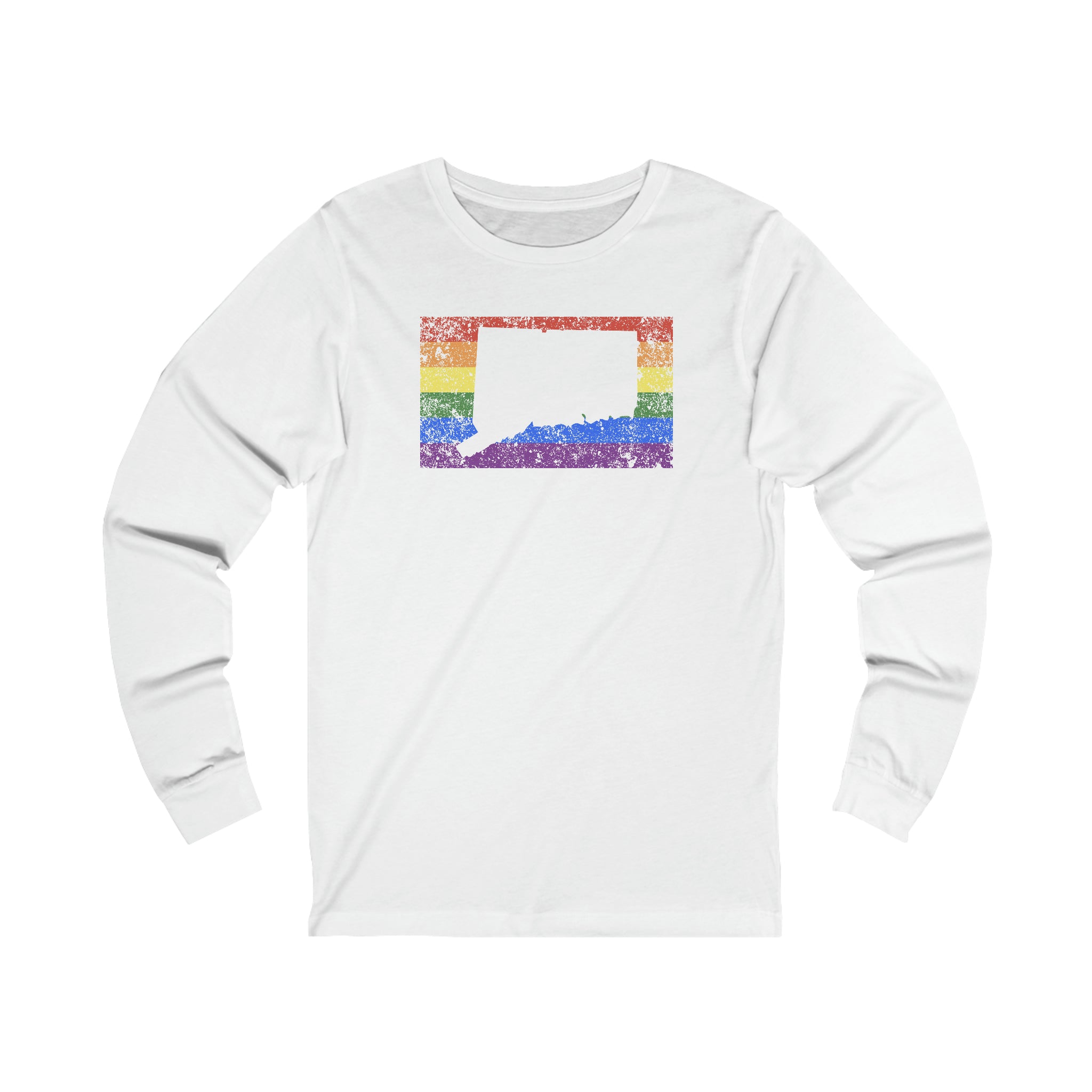Connecticut Pride Flag Long Sleeve Tee: Rainbow LGBTQ+ State Silhouette Distressed Long Sleeve T-Shirt
