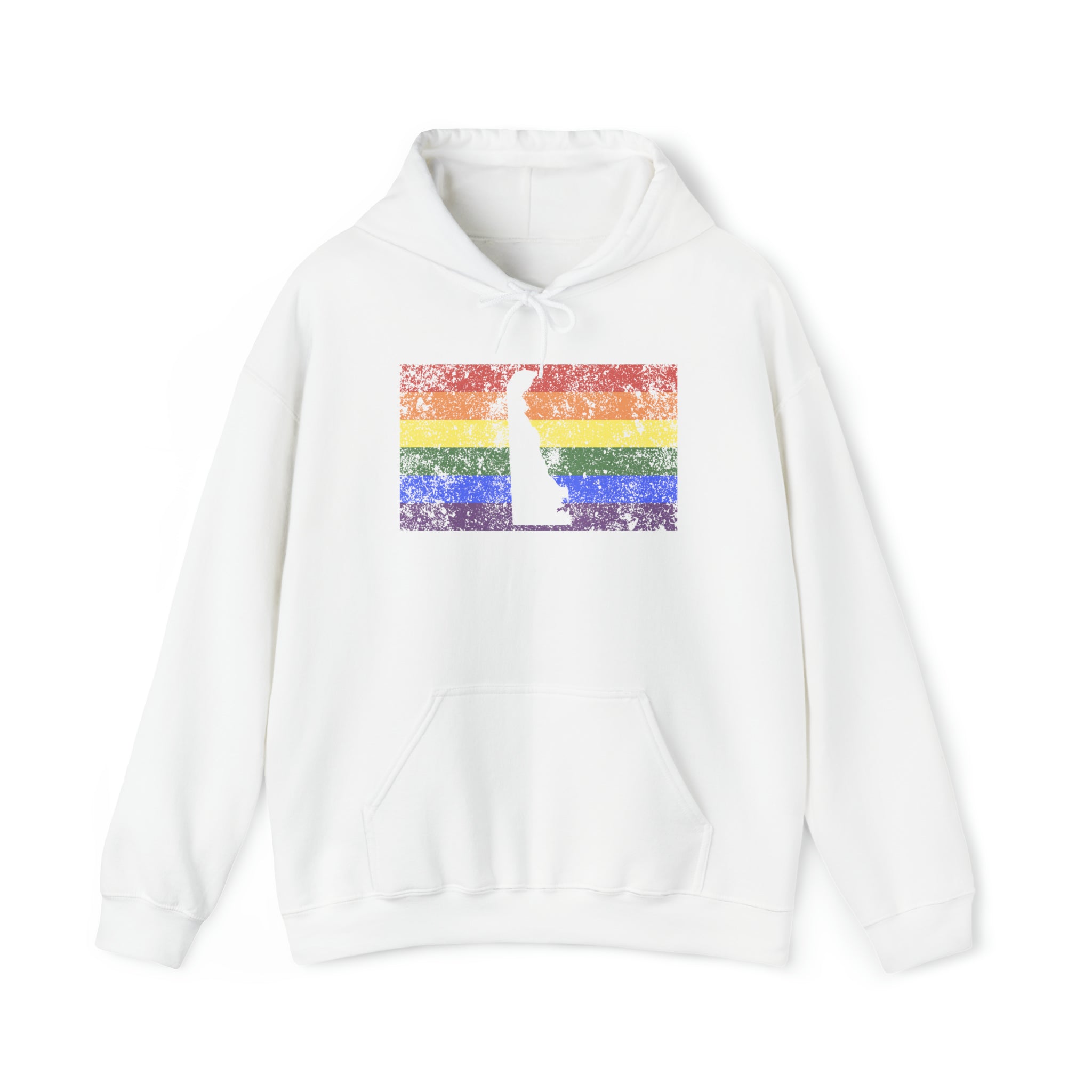 Delaware Pride Flag Hoodie: Rainbow LGBTQ+ State Silhouette Distressed Hooded Sweatshirt
