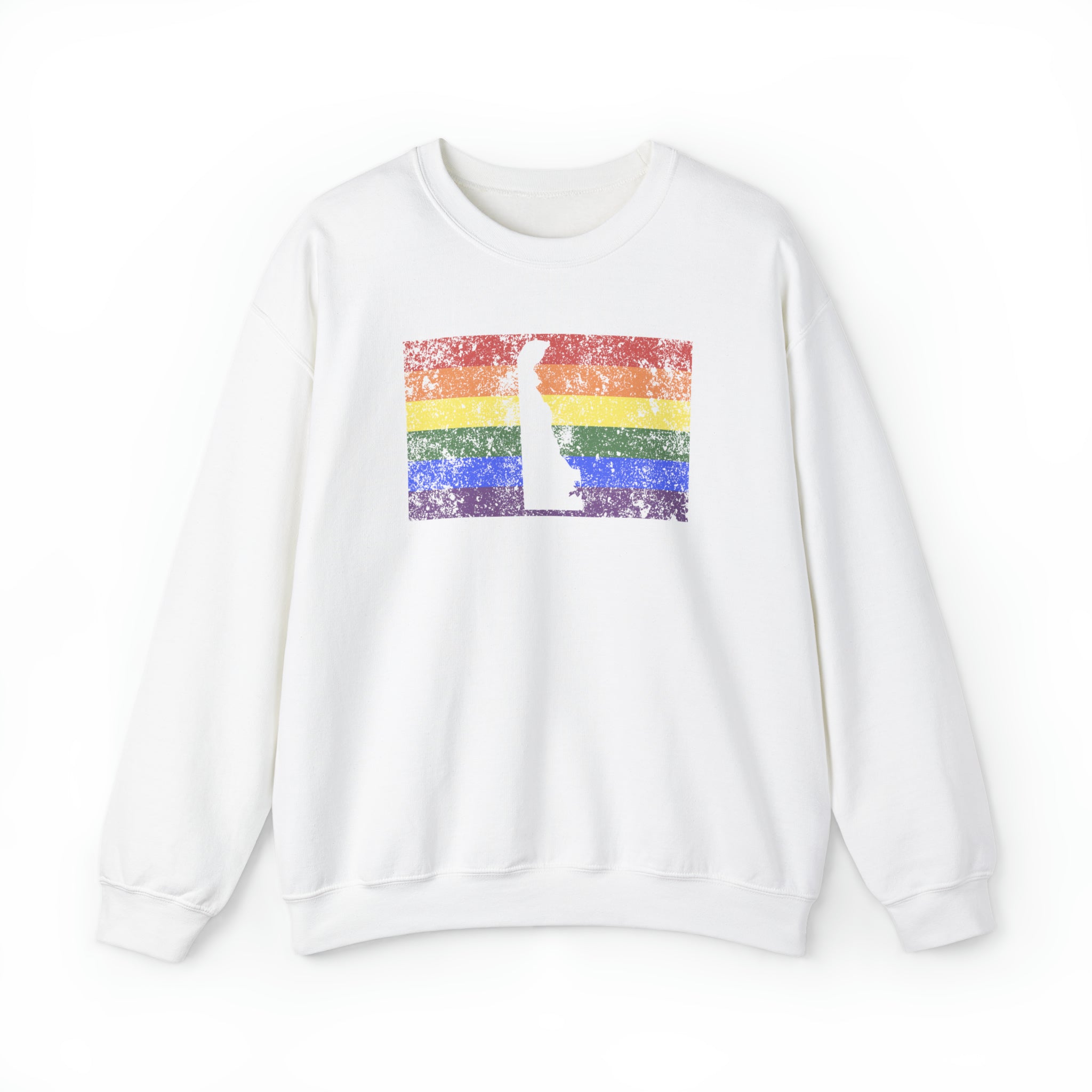 Delaware Pride Flag Sweater: Rainbow LGBTQ+ State Silhouette Distressed Sweatshirt