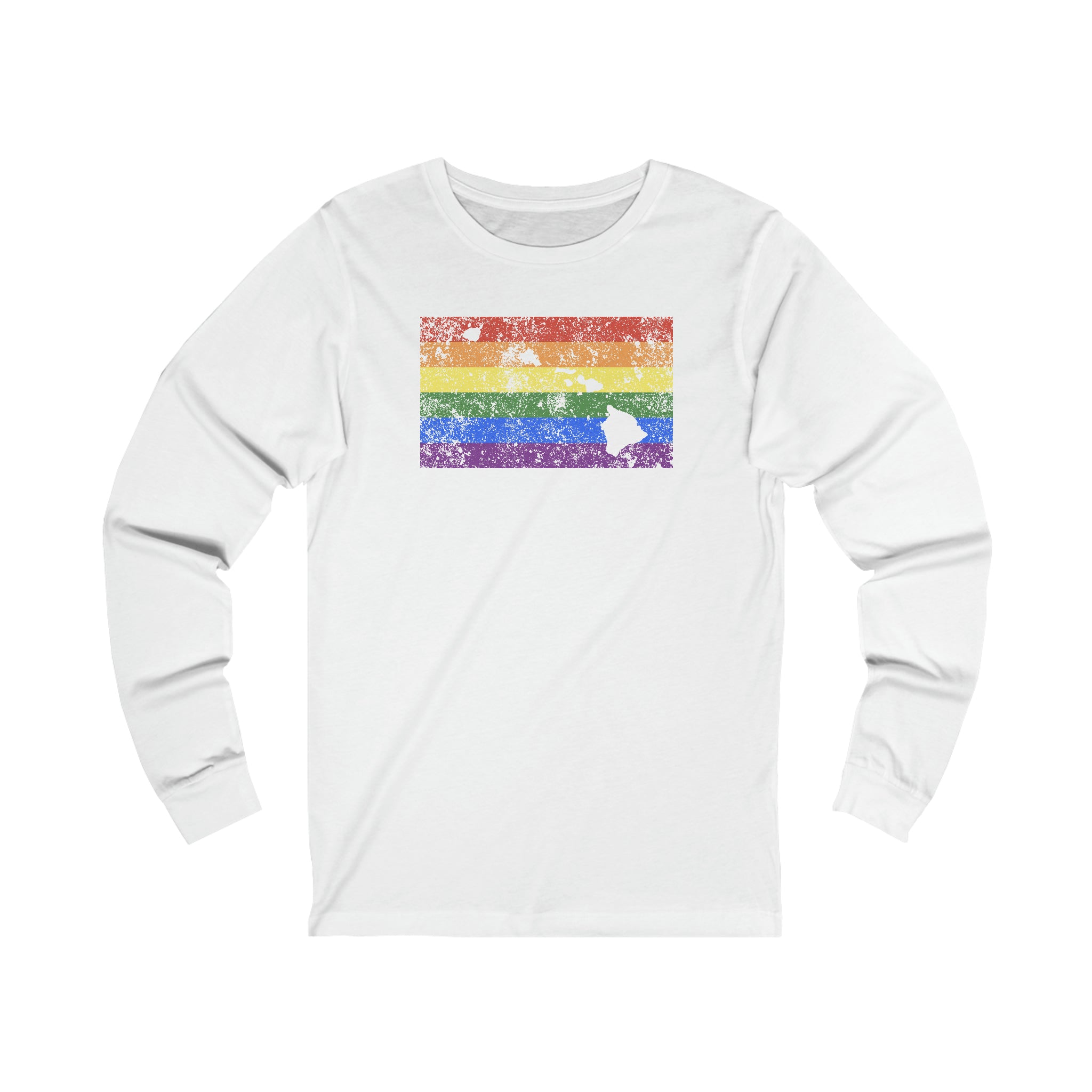 Hawaii Pride Flag Long Sleeve Tee: Rainbow LGBTQ+ State Silhouette Distressed Long Sleeve T-Shirt