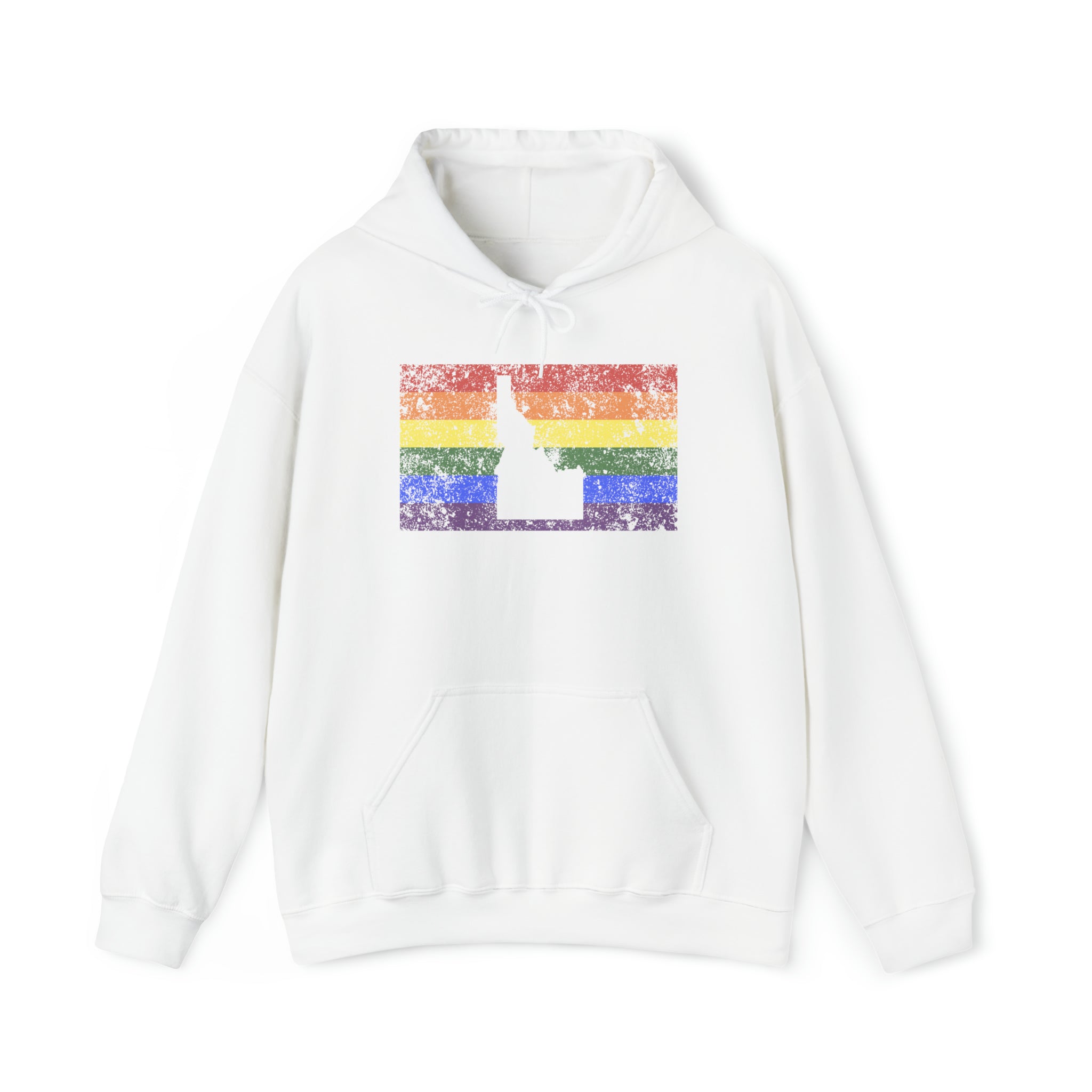 Idaho Pride Flag Hoodie: Rainbow LGBTQ+ State Silhouette Distressed Hooded Sweatshirt