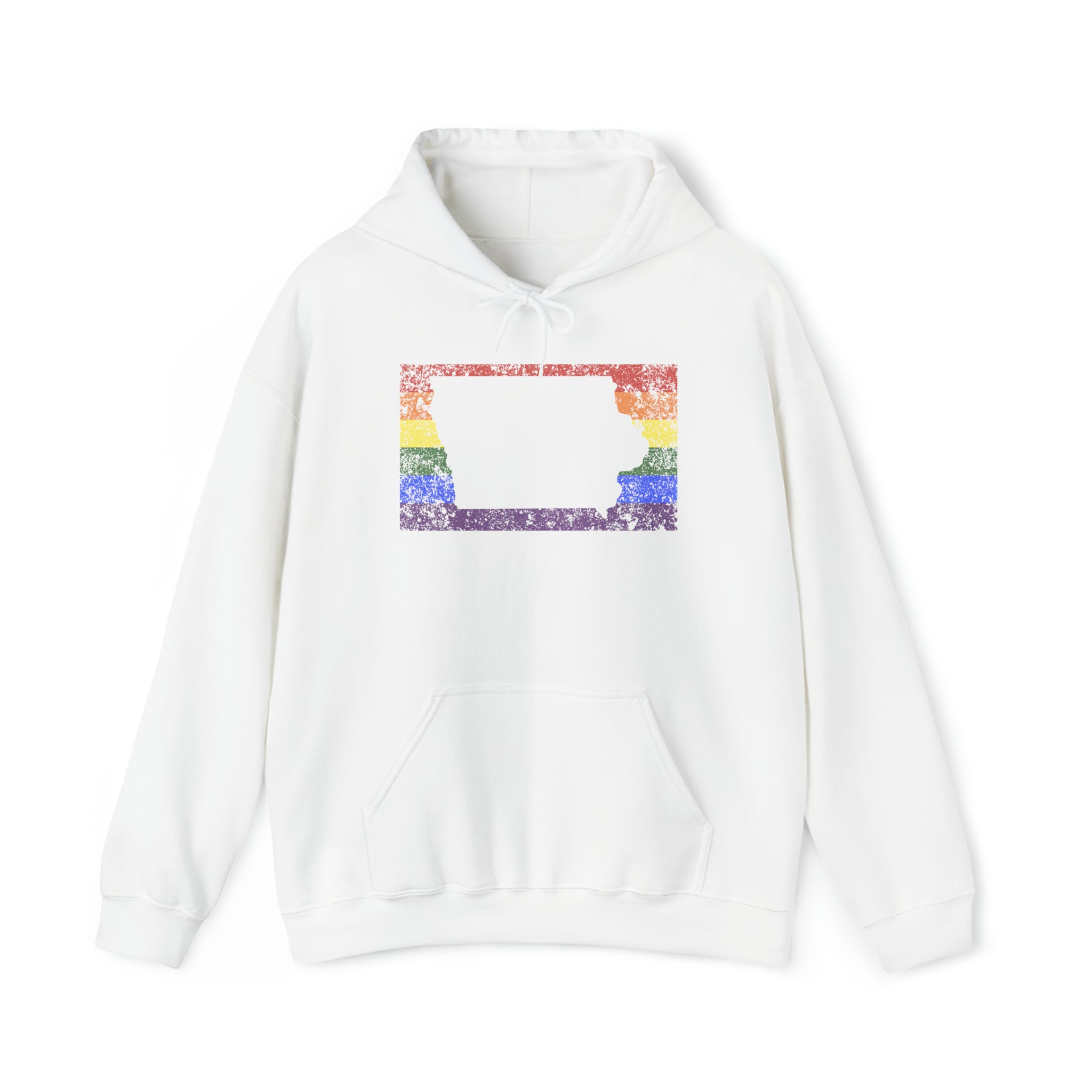 Iowa Pride Flag Hoodie: Rainbow LGBTQ+ State Silhouette Distressed Hooded Sweatshirt