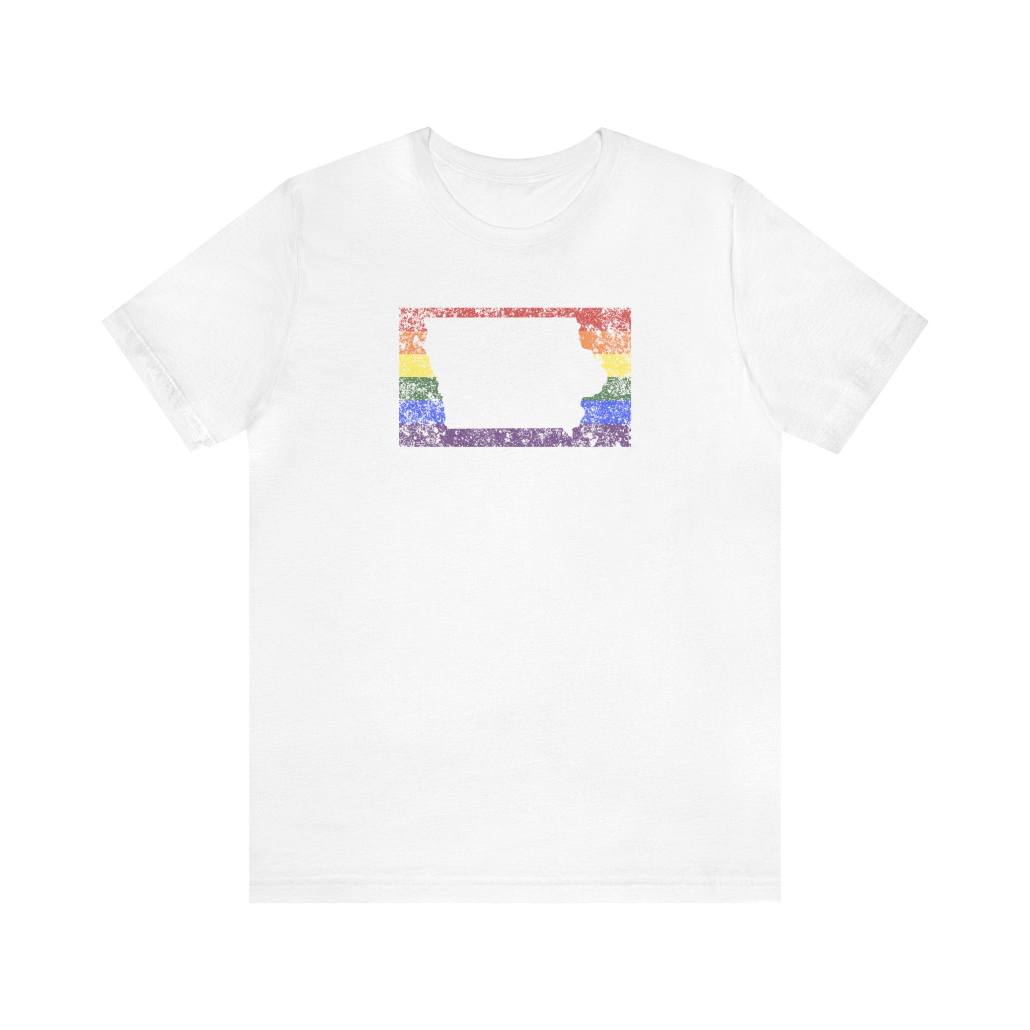 Iowa Pride Flag Tee: Rainbow LGBTQ+ State Silhouette Distressed Shirt