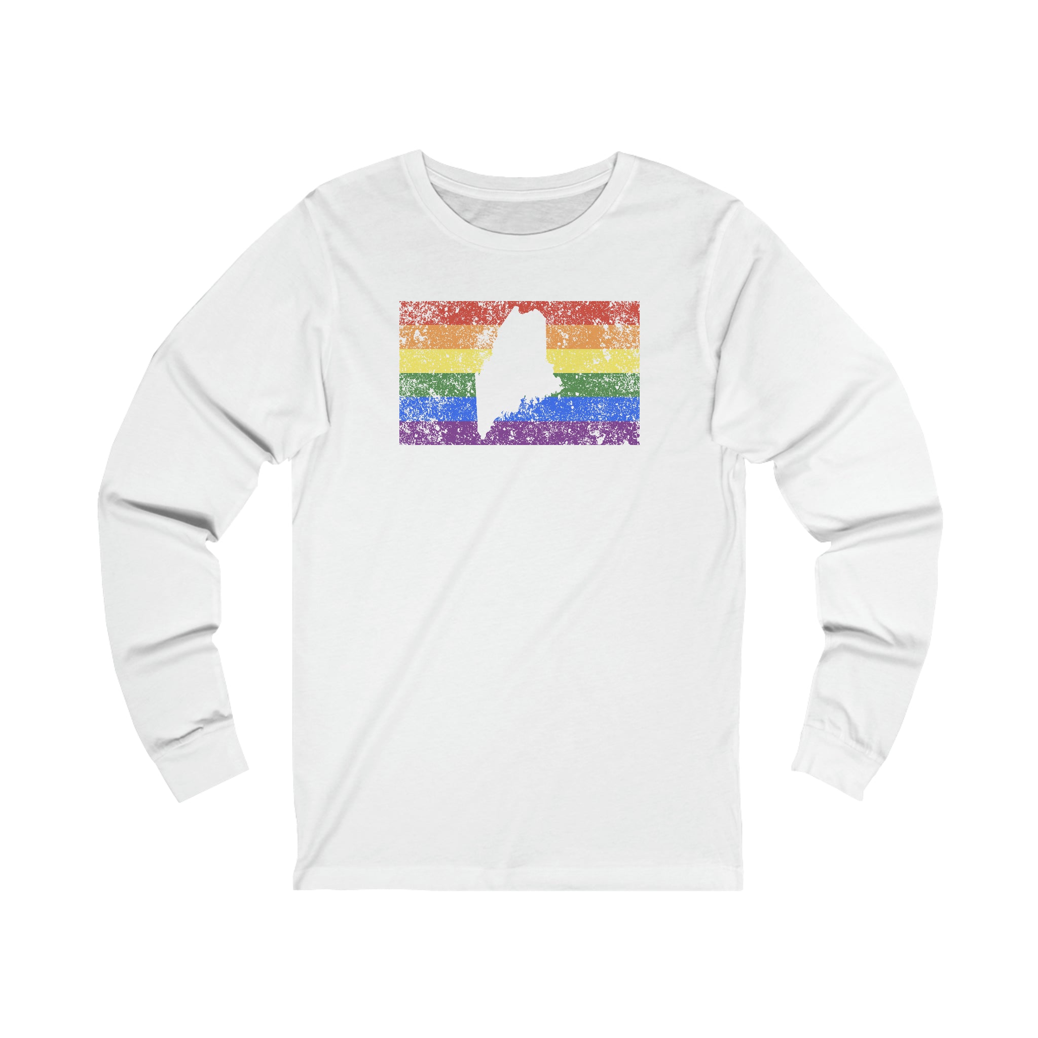 Maine Pride Flag Long Sleeve Tee: Rainbow LGBTQ+ State Silhouette Distressed Long Sleeve T-Shirt
