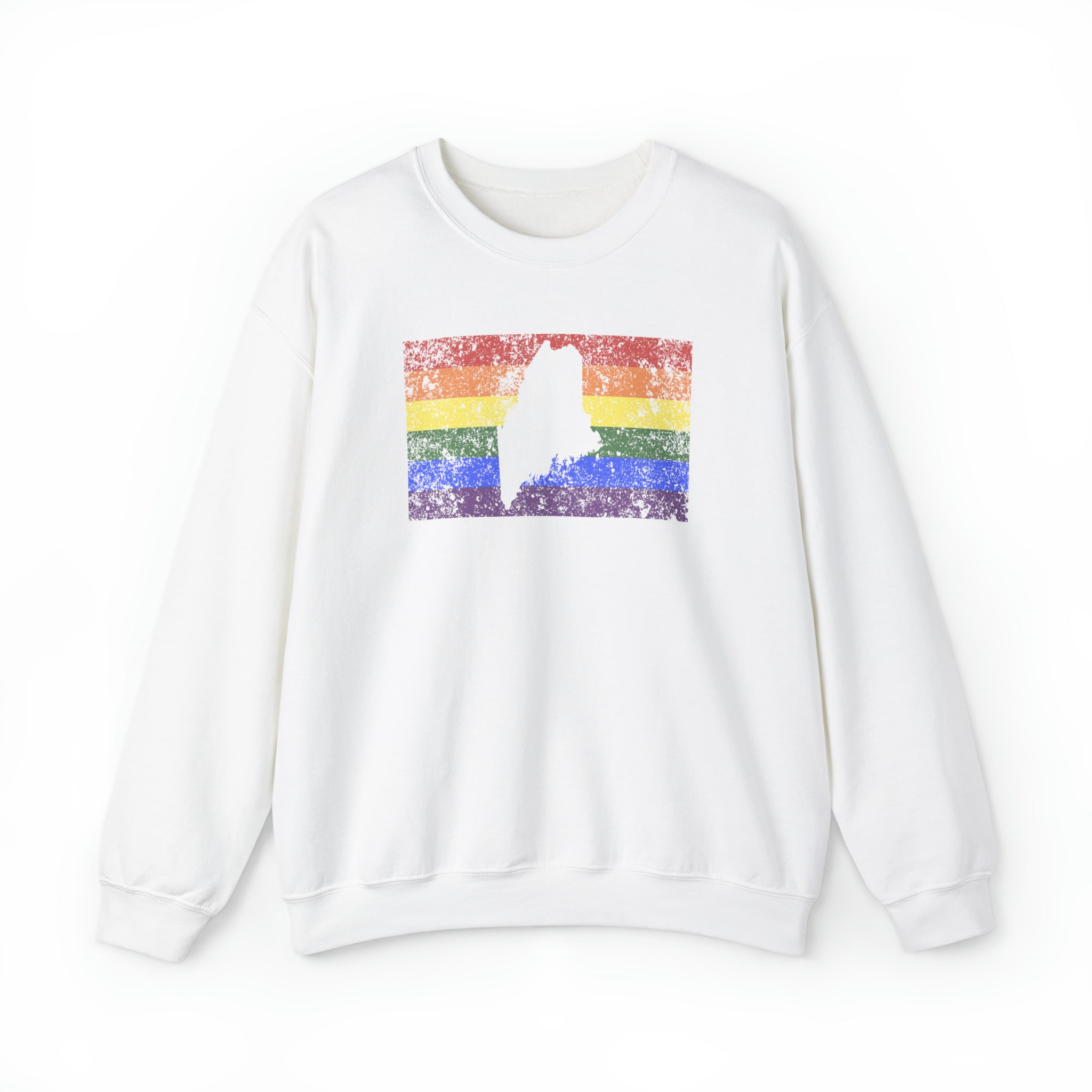 Maine Pride Flag Sweater: Rainbow LGBTQ+ State Silhouette Distressed Sweatshirt