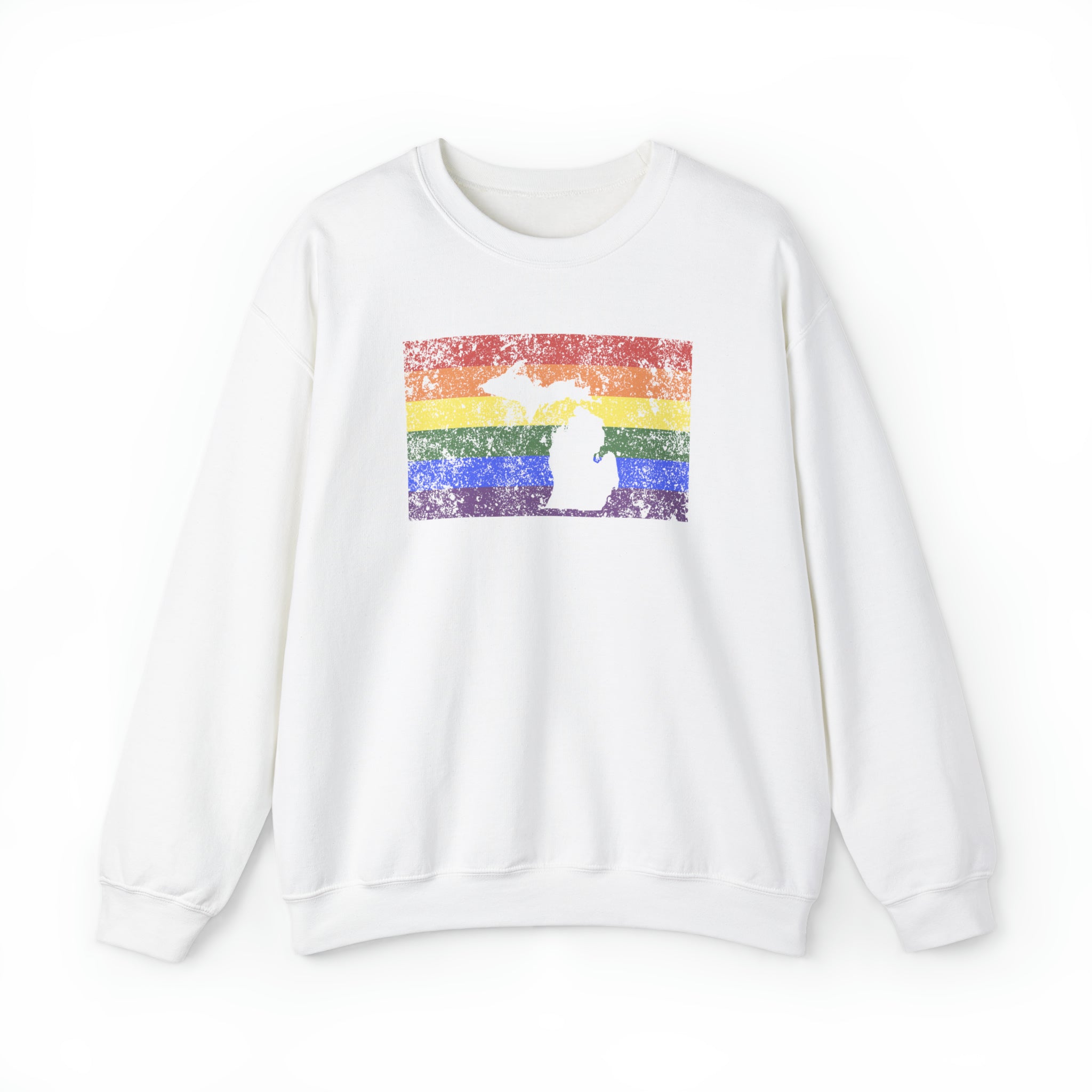 Michigan Pride Flag Sweater: Rainbow LGBTQ+ State Silhouette Distressed Sweatshirt