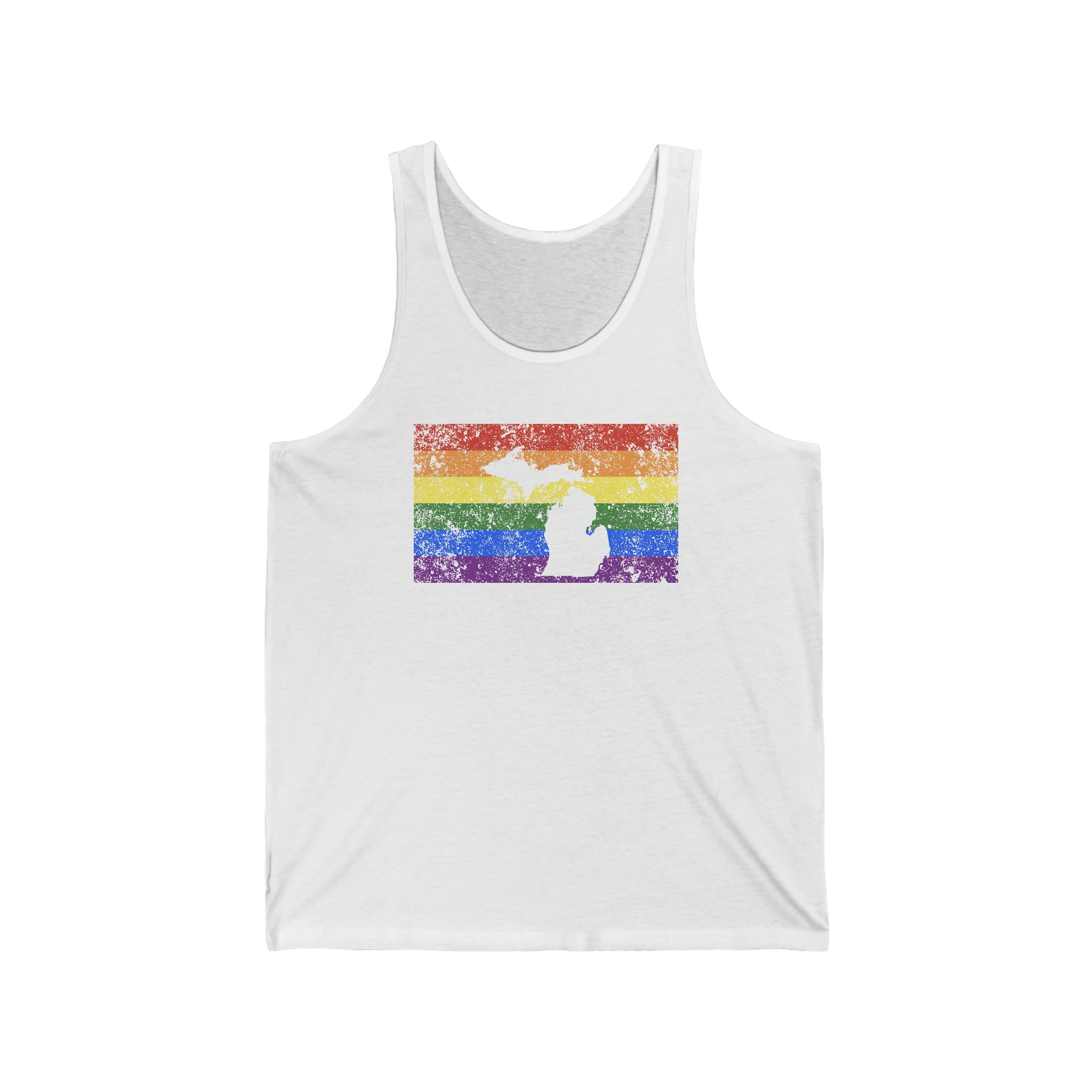 Michigan Pride Flag Tank: Rainbow LGBTQ+ State Silhouette Distressed Tank-Top