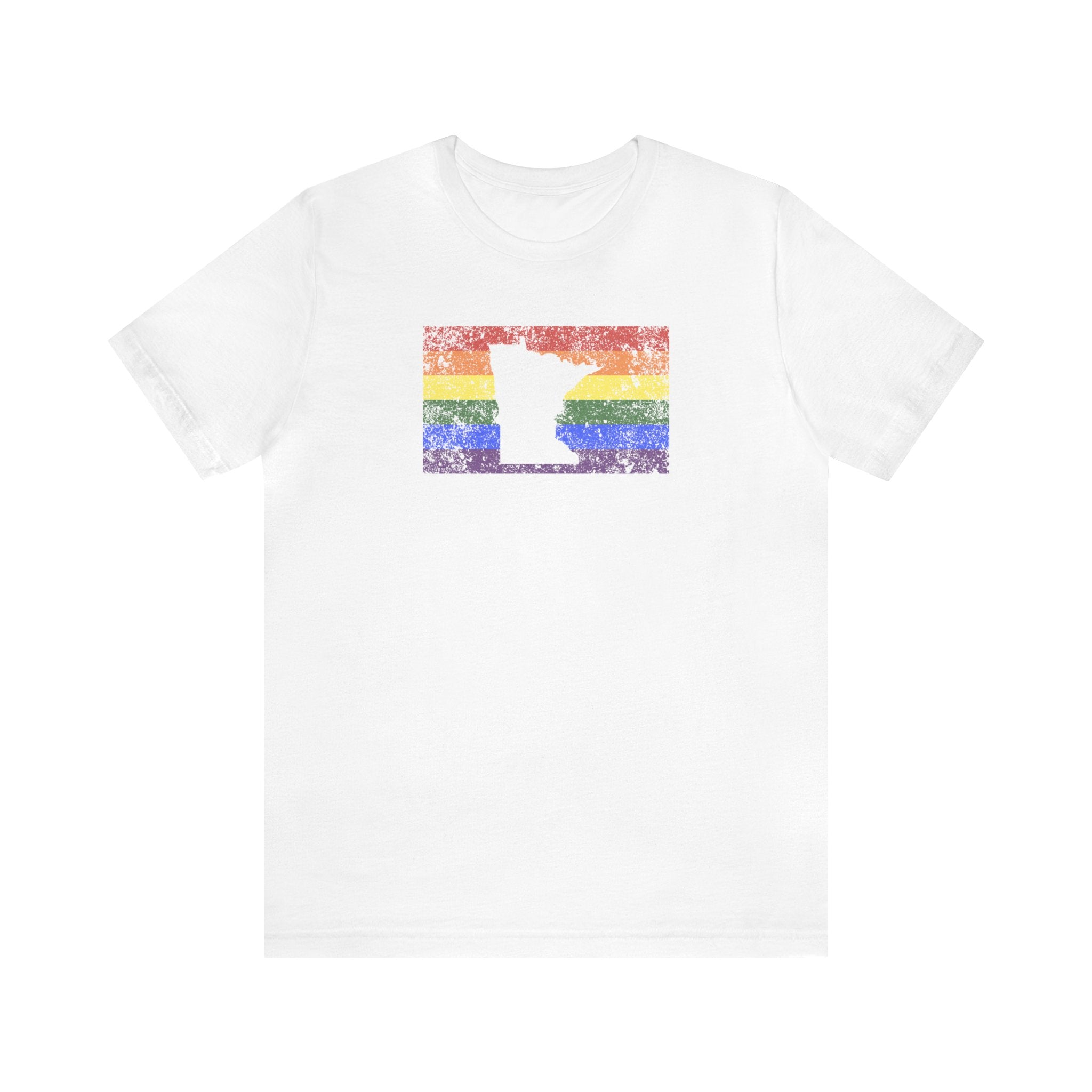 Minnesota Pride Flag Tee: Rainbow LGBTQ+ State Silhouette Distressed Shirt
