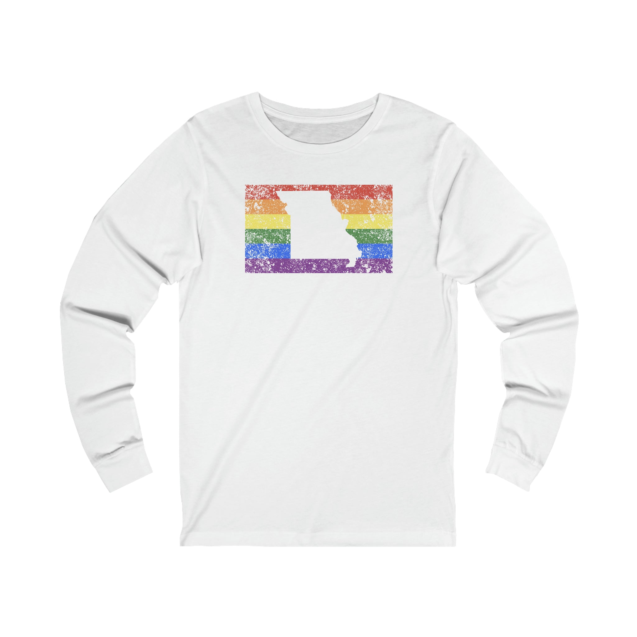 Missouri Pride Flag Long Sleeve Tee: Rainbow LGBTQ+ State Silhouette Distressed Long Sleeve T-Shirt