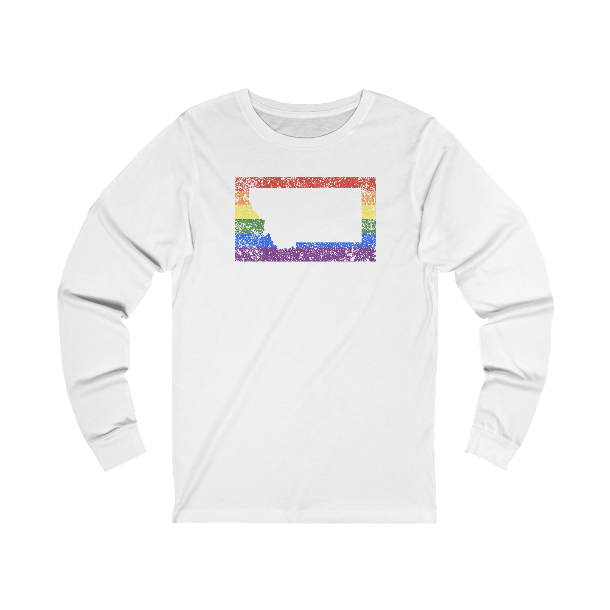 Montana Pride Flag Long Sleeve Tee: Rainbow LGBTQ+ State Silhouette Distressed Long Sleeve T-Shirt