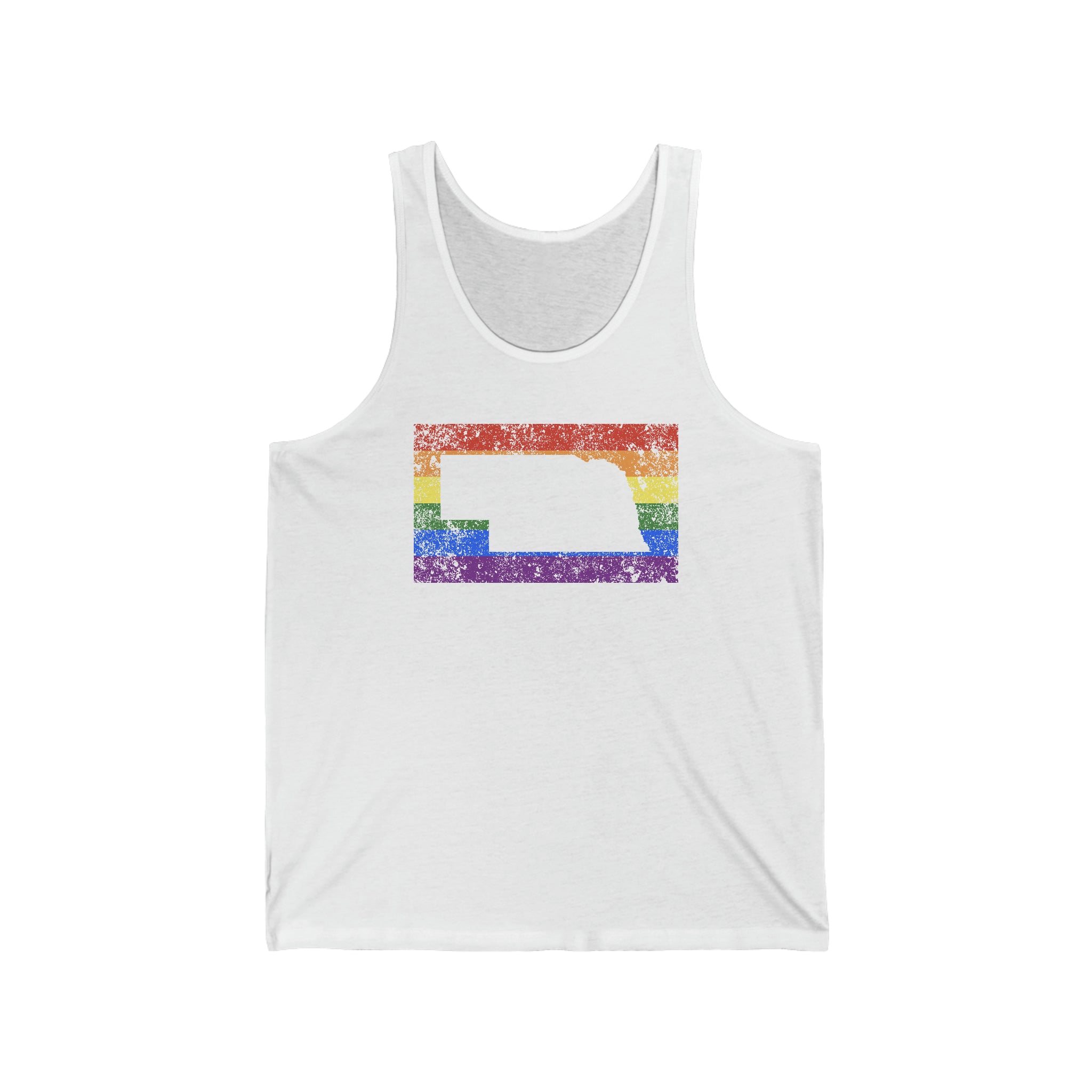 Nebraska Pride Flag Tank: Rainbow LGBTQ+ State Silhouette Distressed Tank-Top