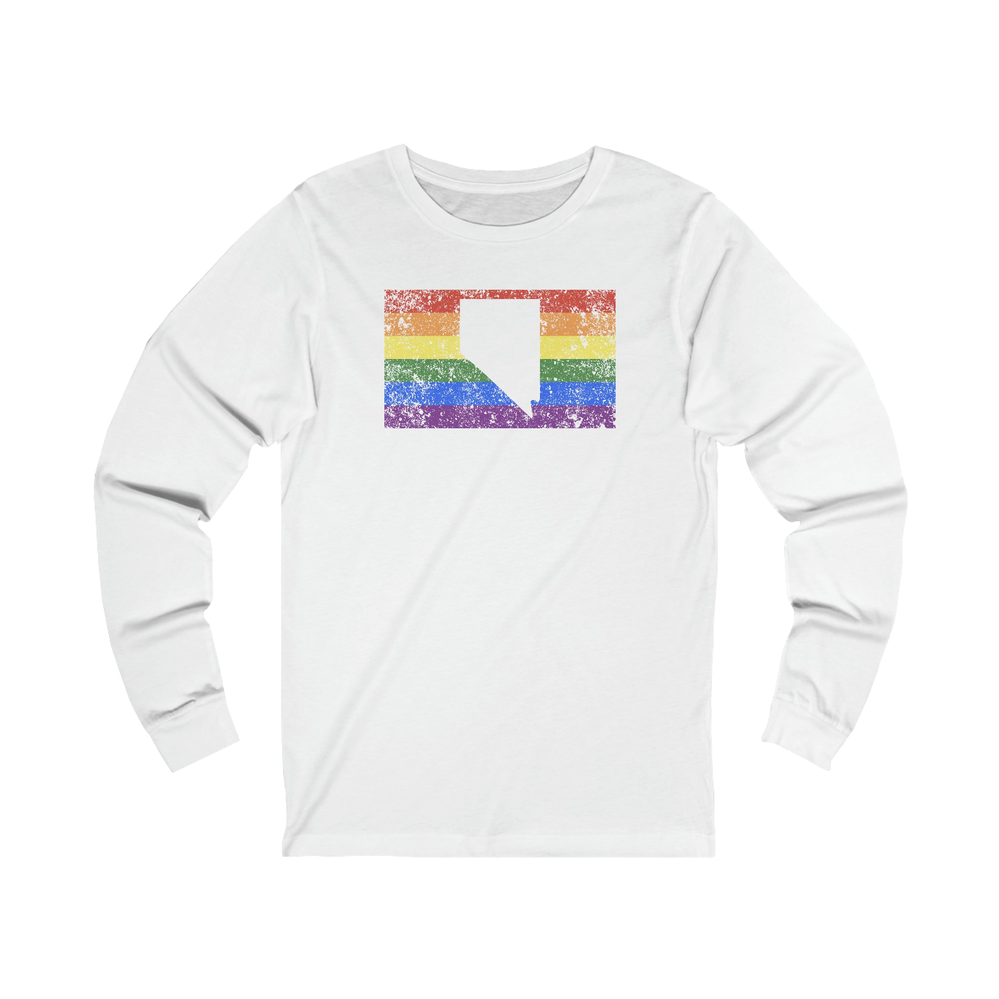 Nevada Pride Flag Long Sleeve Tee: Rainbow LGBTQ+ State Silhouette Distressed Long Sleeve T-Shirt