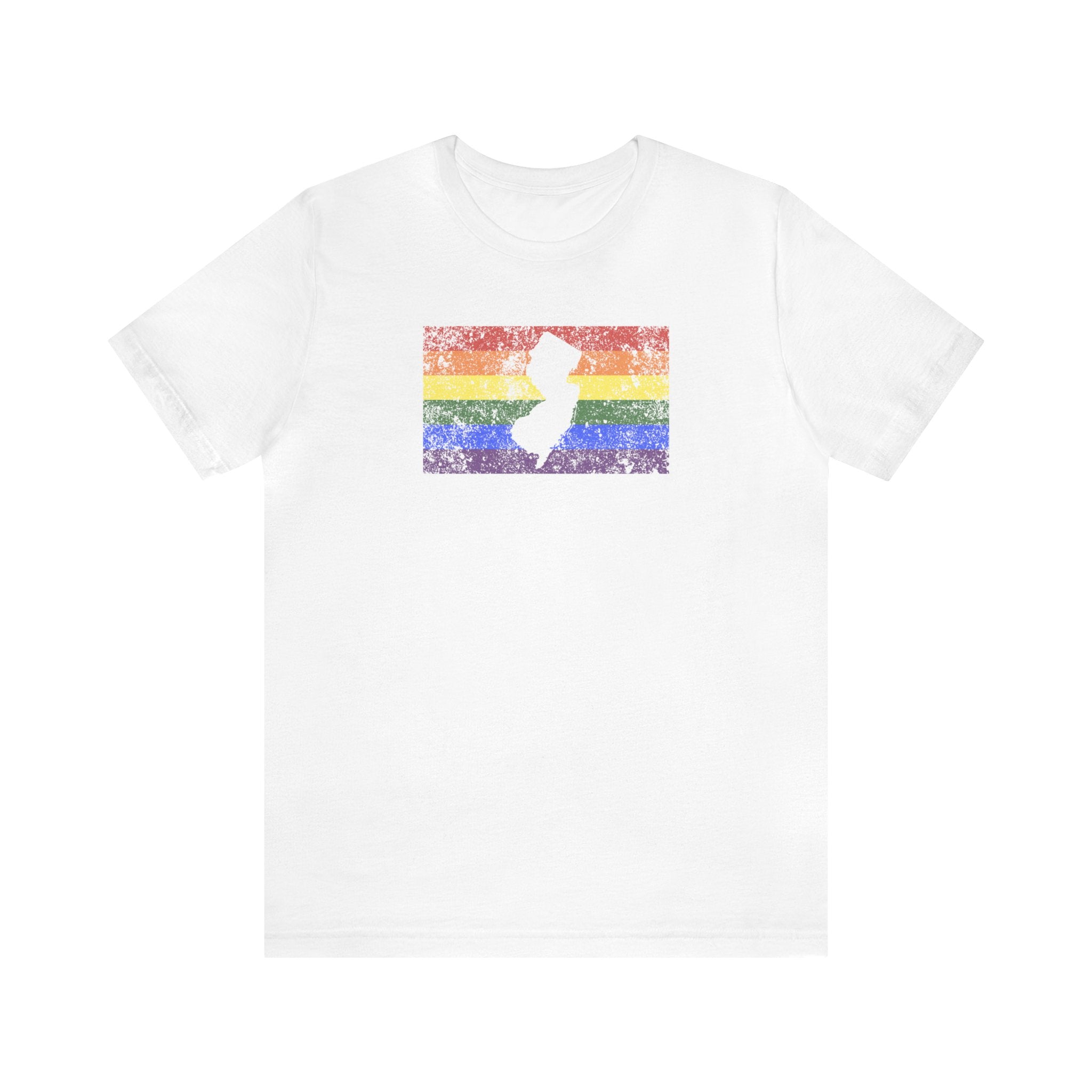 New Jersey Pride Flag Tee: Rainbow LGBTQ+ State Silhouette Distressed Shirt