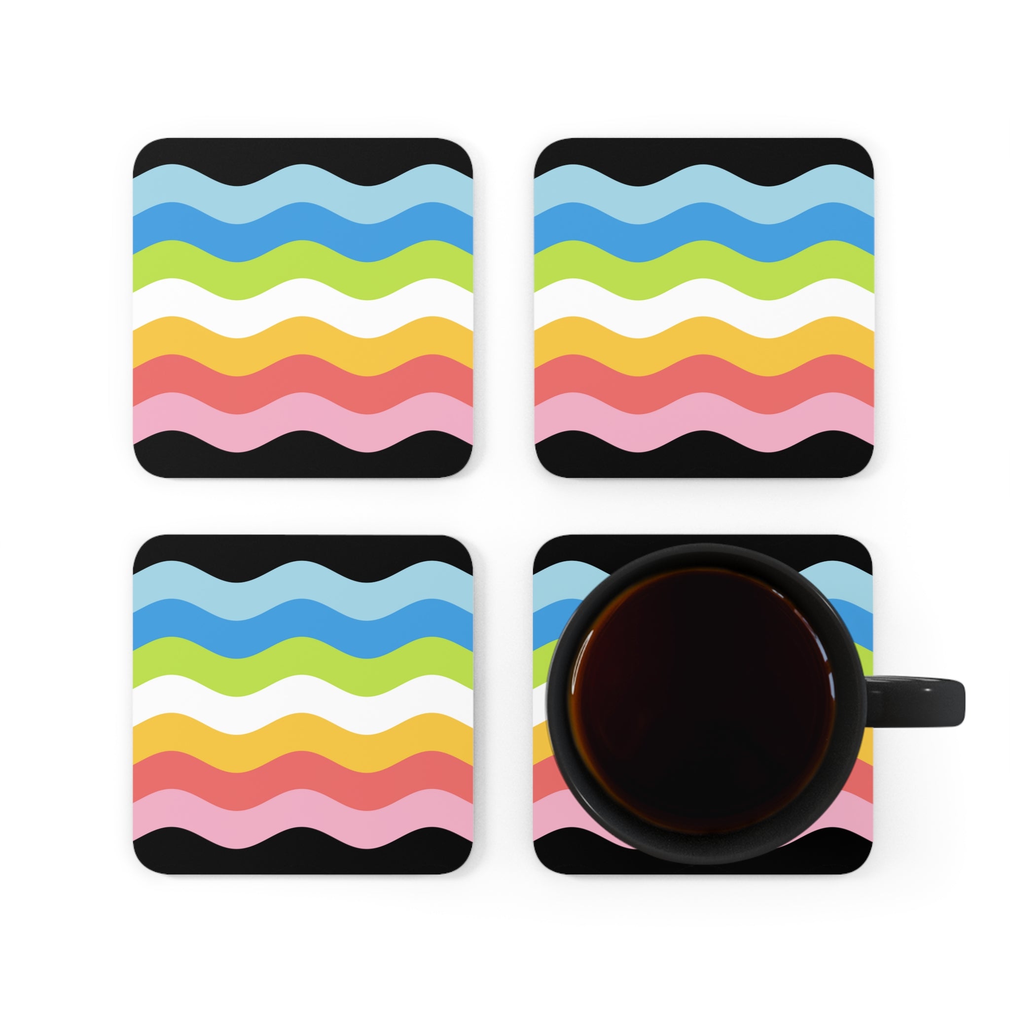 Brighten your space with our "Queer Pride Flag Corkwood Coaster Set". This set of four coasters blends practicality with pride, featuring the Queer Pride flag in a unique ripple pattern. Crafted from durable corkwood, each coaster protects your surfaces while adding a pop of Queer pride to your home. Ideal for any setting, these coasters are not just functional, they're a statement of support and inclusivity. A perfect addition to any gathering or a thoughtful gift, these coasters celebrate identity with every use.