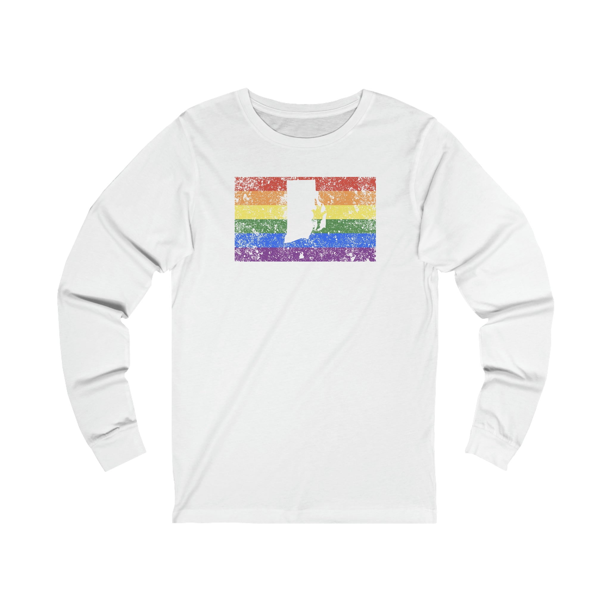 Rhode Island Pride Flag Long Sleeve Tee: Rainbow LGBTQ+ State Silhouette Distressed Long Sleeve T-Shirt