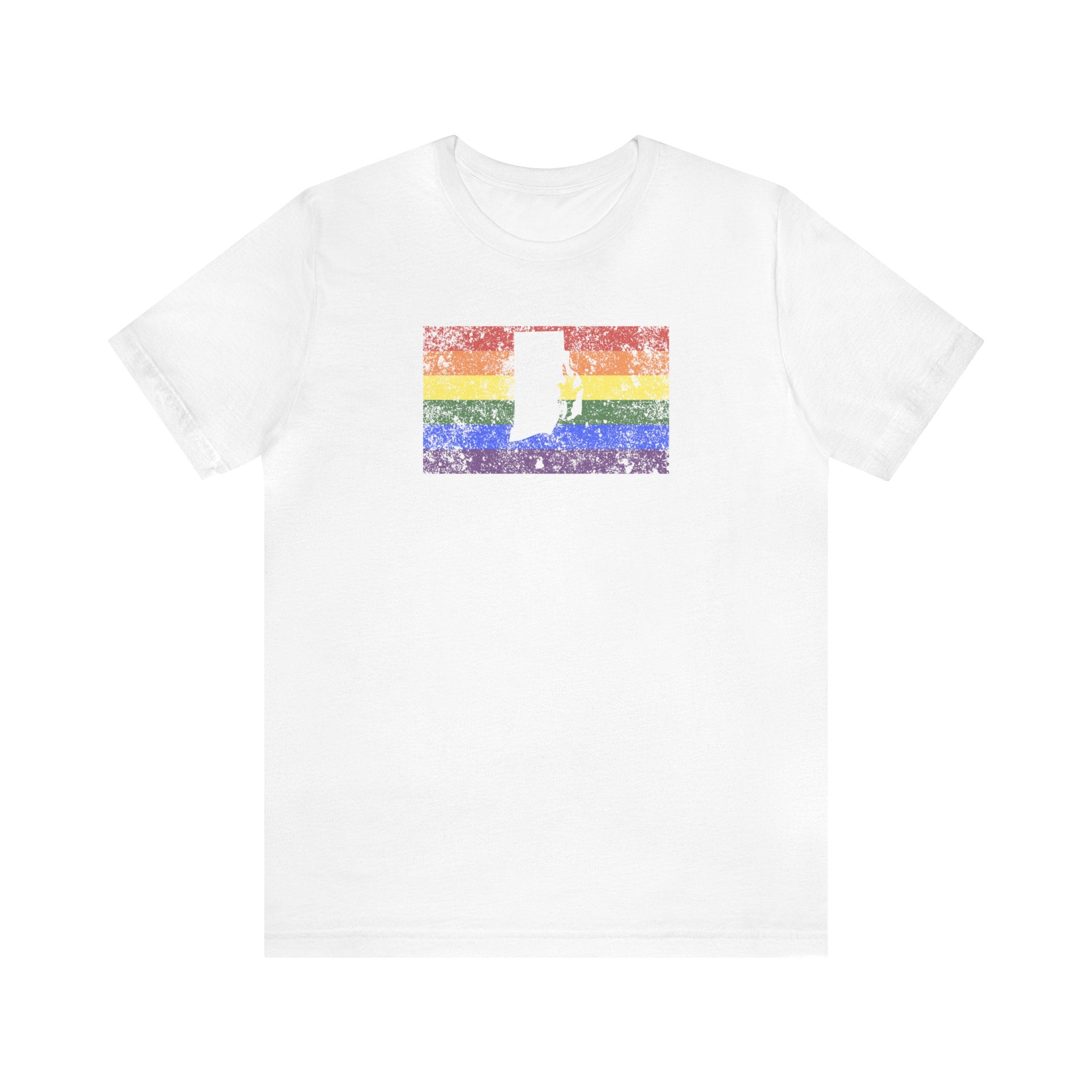 Rhode Island Pride Flag Tee: Rainbow LGBTQ+ State Silhouette Distressed Shirt