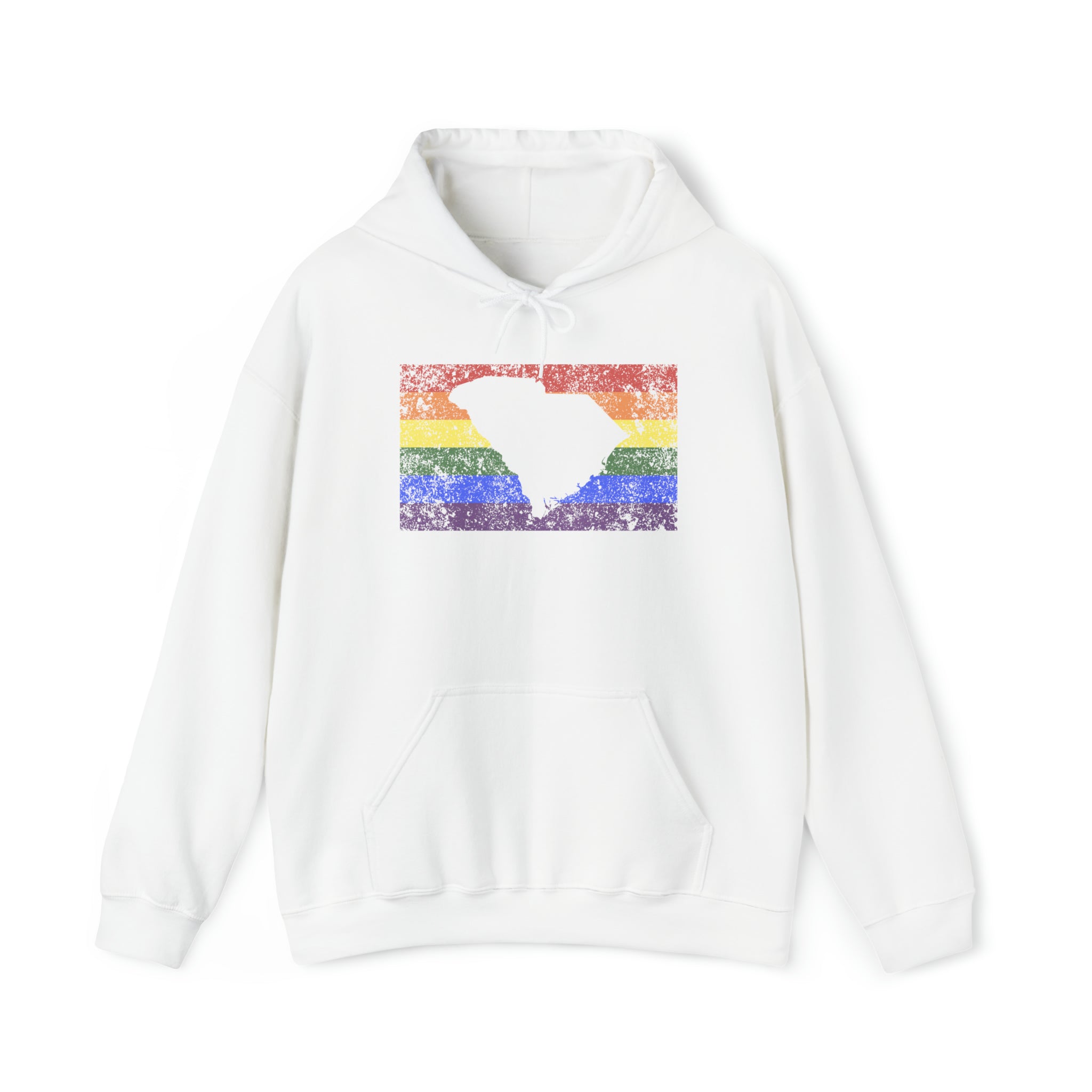South Carolina Pride Flag Hoodie: Rainbow LGBTQ+ State Silhouette Distressed Hooded Sweatshirt