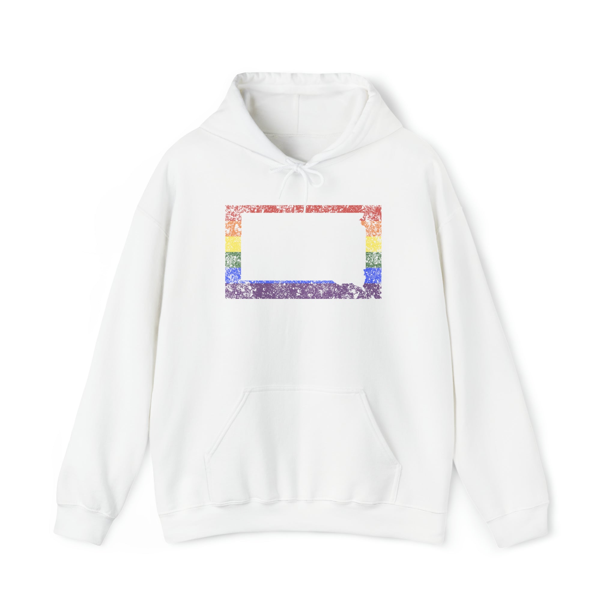 South Dakota Pride Flag Hoodie: Rainbow LGBTQ+ State Silhouette Distressed Hooded Sweatshirt